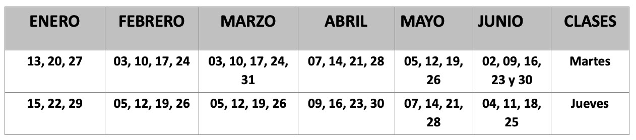Clases: Martes y Jueves de 16:30 a 20:30h